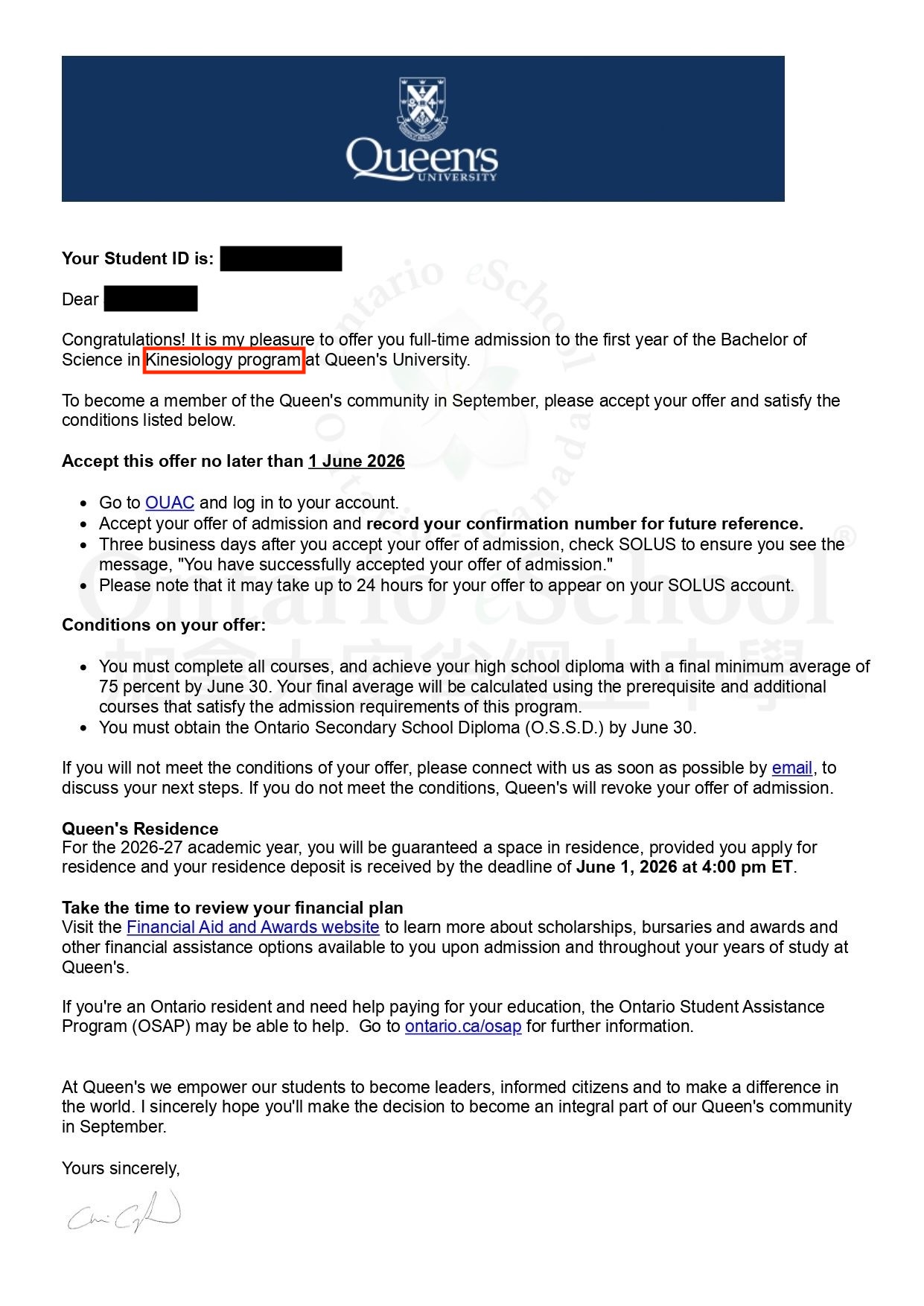 恭喜OeS 2026學年畢業的學生獲得 Queen's University 的錄取通知