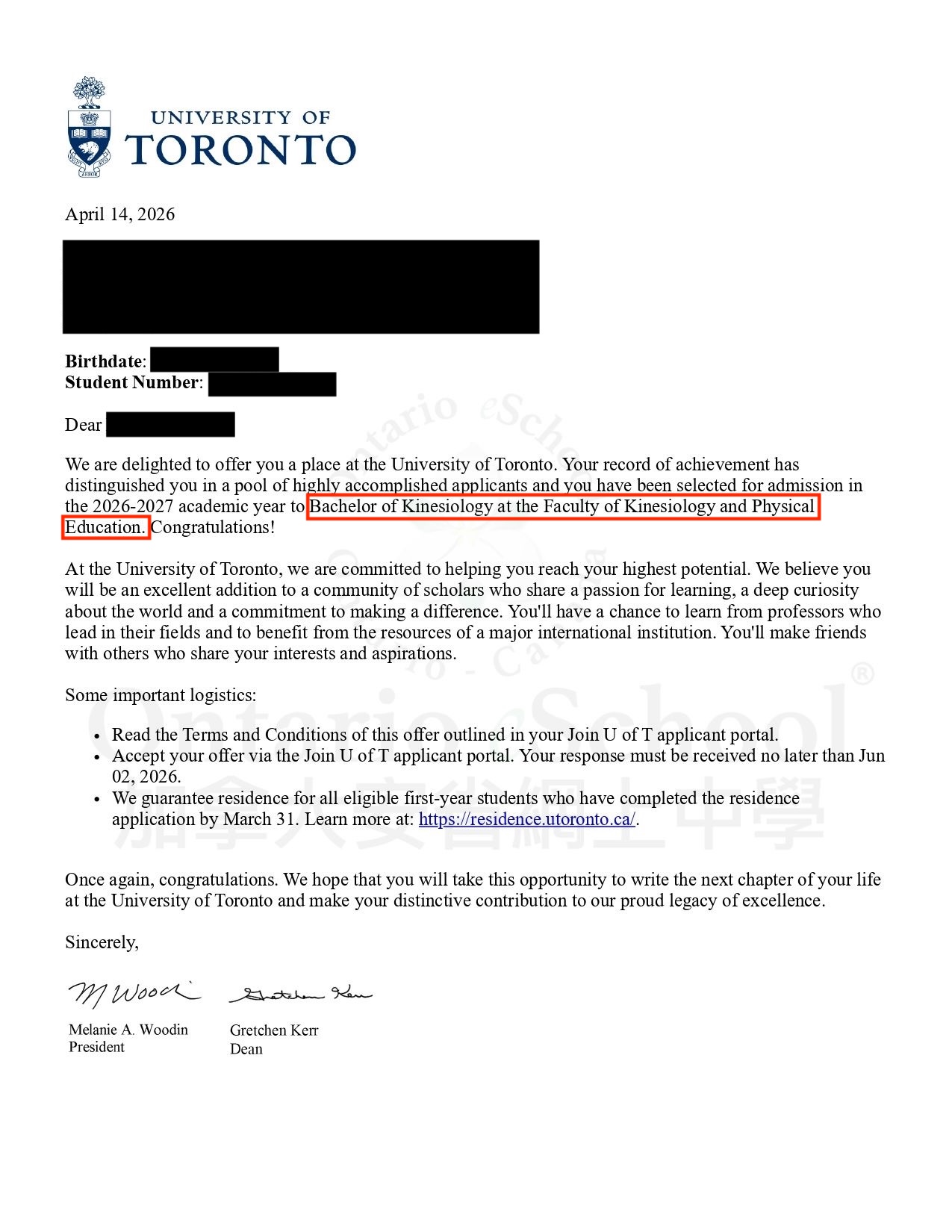 恭喜OeS 2026學年畢業的學生獲得 University of Toronto 的錄取通知